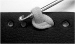 1. Беремо дно лицьовою стороною до себе. Нитка розташувати з вивороту. Просовуємо гачок в отвір дна витягуємо нитка,