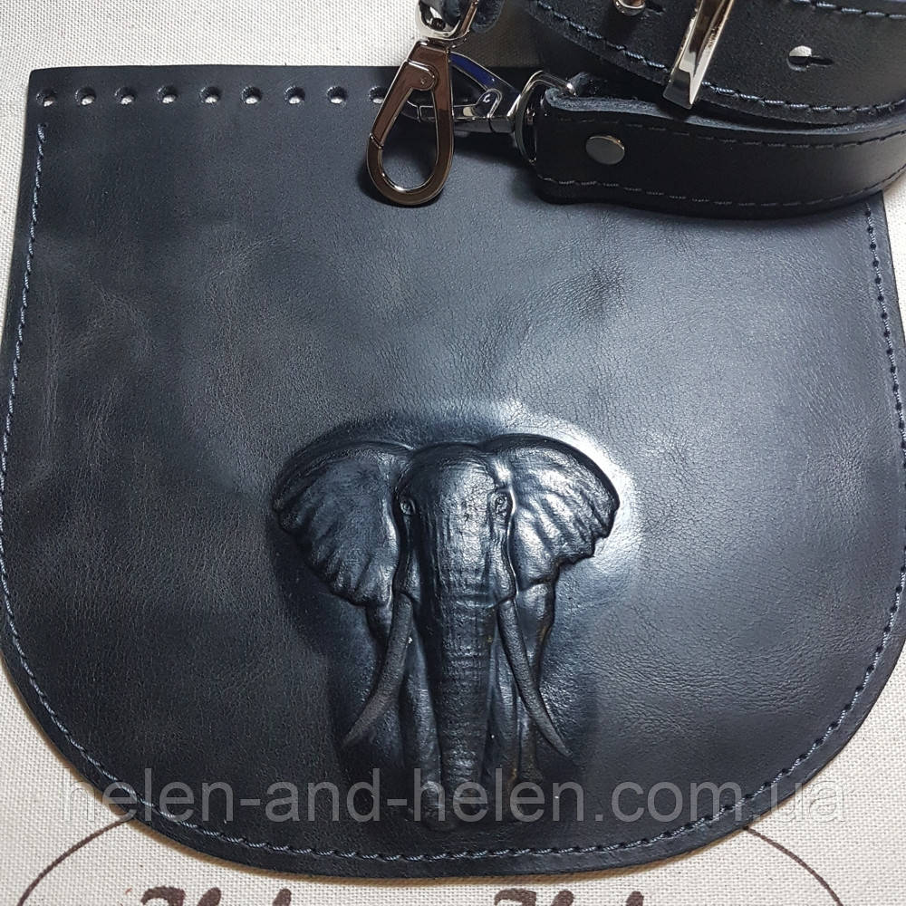 Шкіряний клапан для в'язаної сумочки з 3-Д тисненням "Слон". Колір "Графіт".