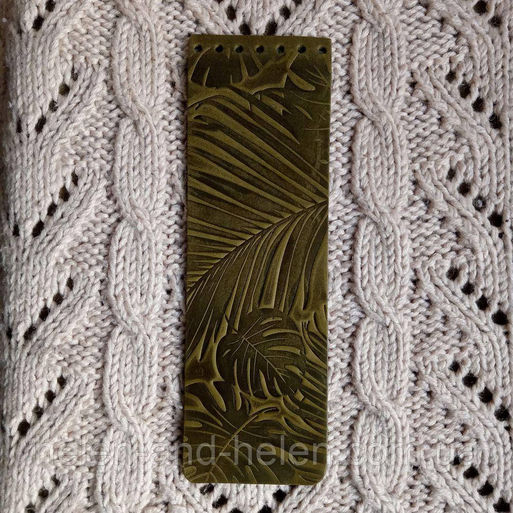 Вузький шкіряний клапан для сумки з тисненням "Пальми" кольору Темна олива. Виготовлений із натуральної шкіри.
